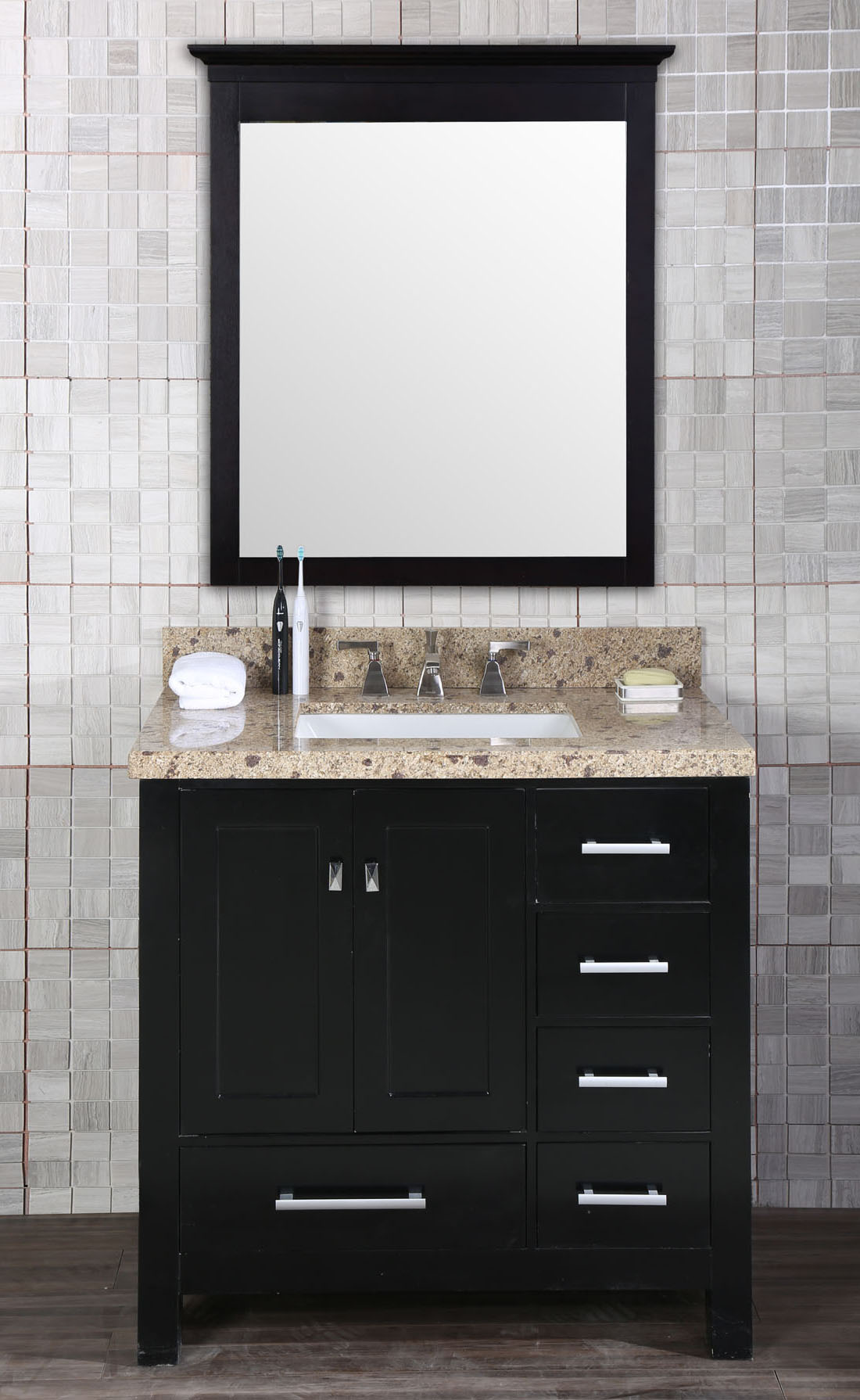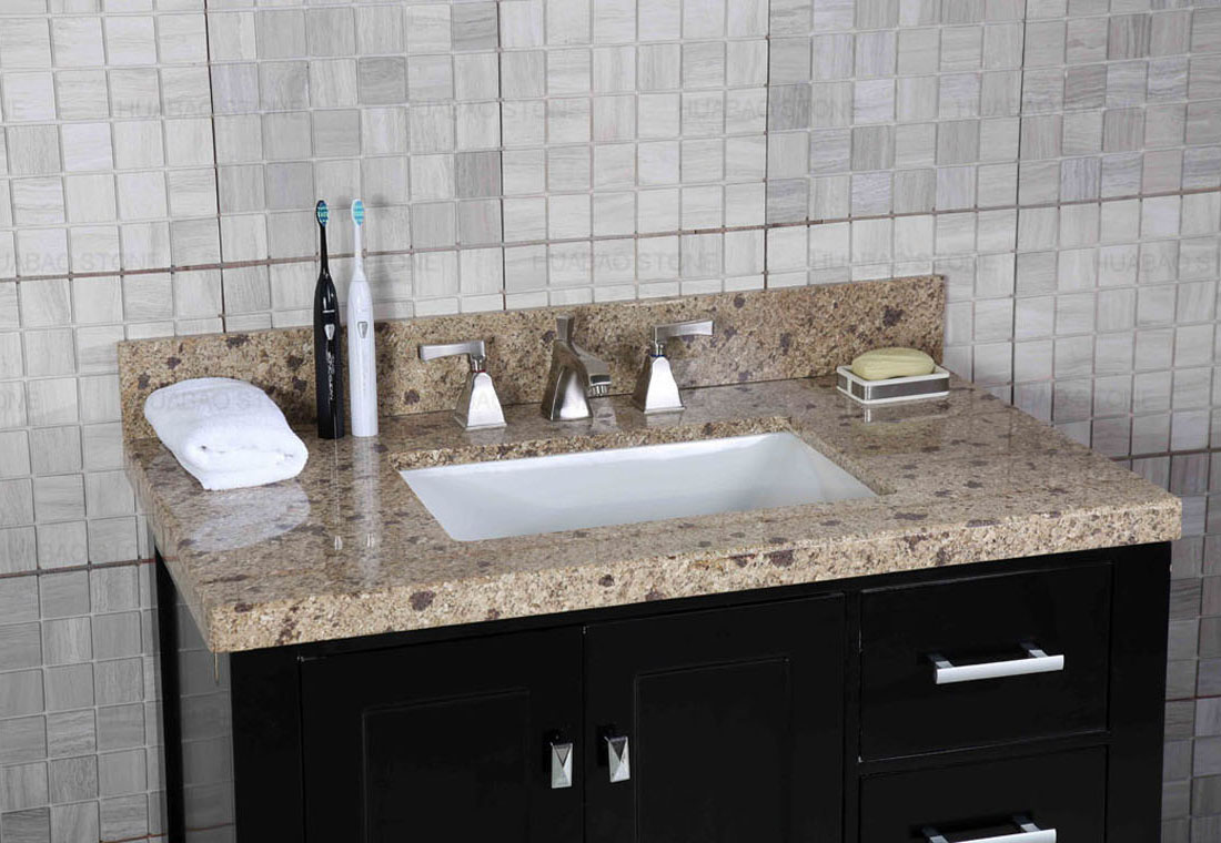 表面磨光,一长边和两短边无缝边磨光,挖一个方型台盆孔,3个水龙头孔,带一片4"后挡板。