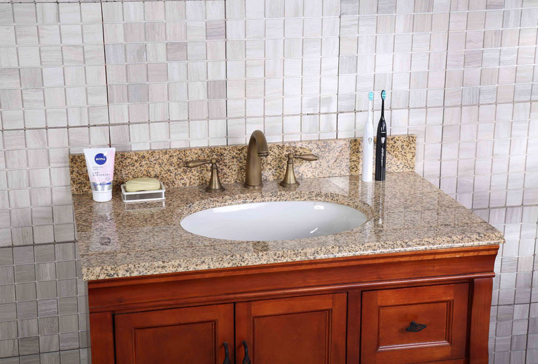 表面磨光,一长边OG边和两短边直边磨光,挖一个椭圆型台盆孔,3个水龙头孔,带一片4"后挡板。