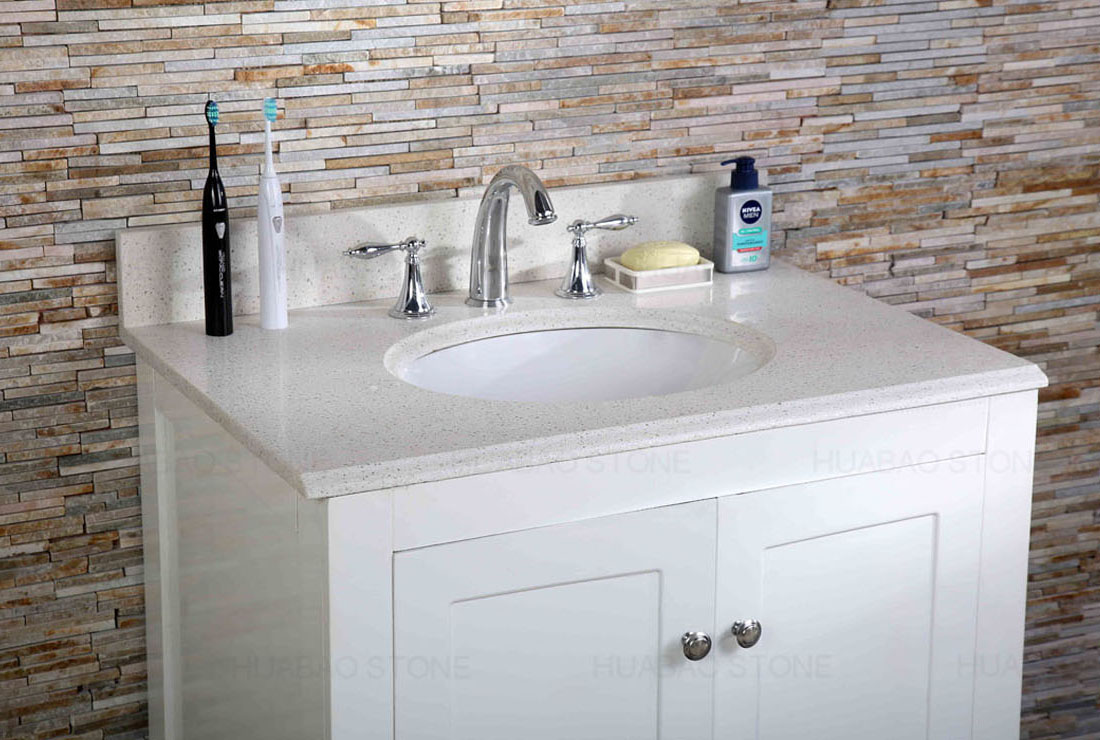 表面磨光,一长边OG边和两短边直边磨光,挖一个椭圆型台盆孔,3个水龙头孔,带一片4"后挡板。